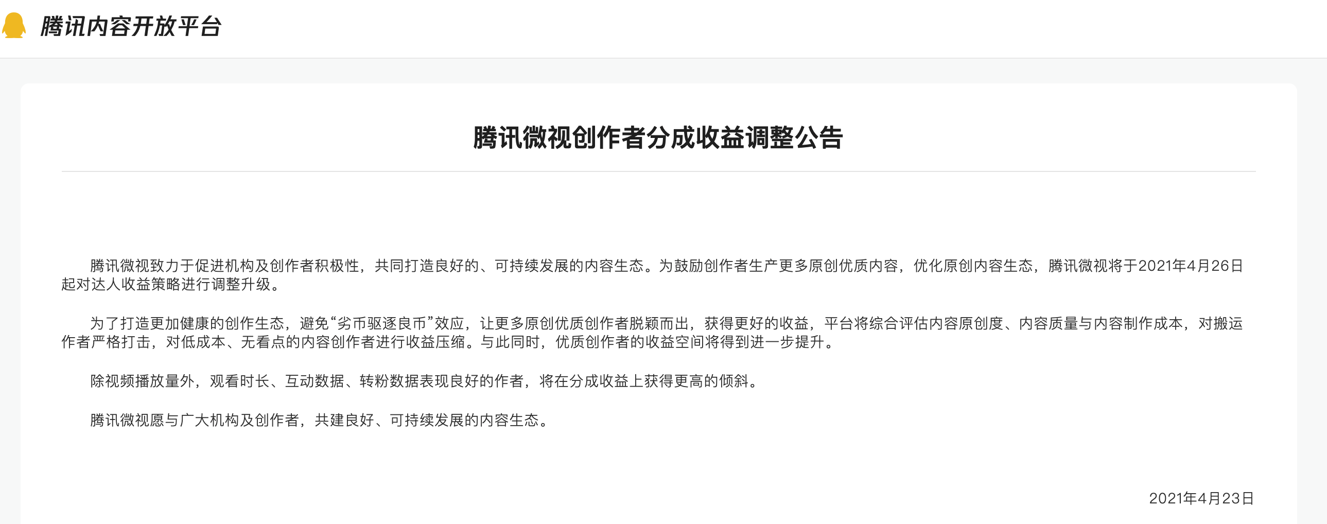 4月24日消息,腾讯内容开放平台于4月23日发布腾讯微视创作者分成收益调整公告:腾讯微视将于2021年4月26日起对达人收益策略进行调整升级。平台将综合评估内容原创度、内容质量与内容制作成本,对搬运作者严格打击,对低成本、无看点的内容创作者进行收益压缩。