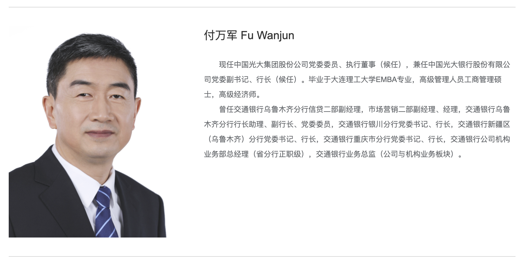 4月24日消息,中国光大集团网站显示,付万军现任中国光大集团股份公司党委委员、执行董事(候任),兼任中国光大银行股份有限公司党委副书记、行长(候任)。