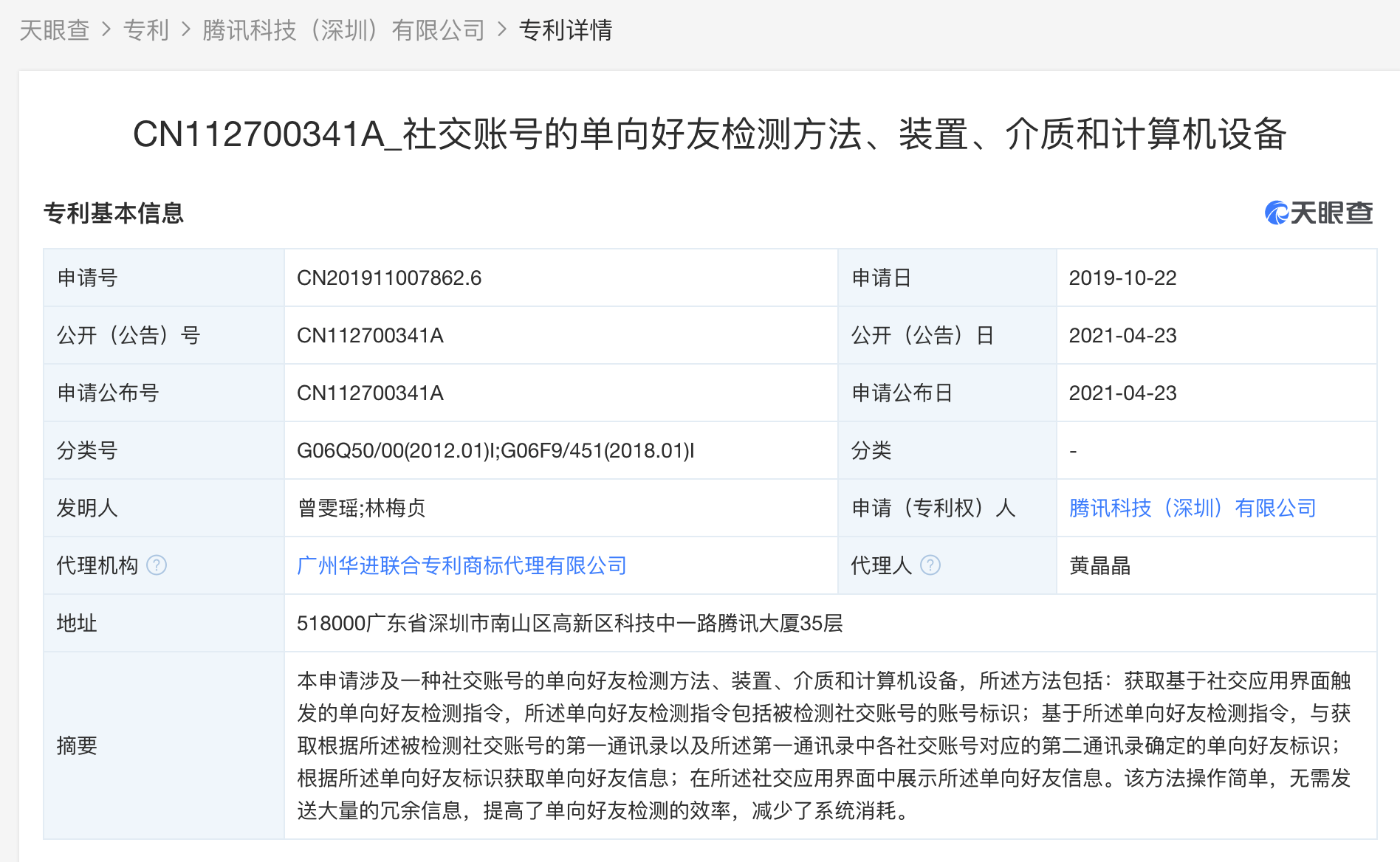 据天眼查APP显示,4月23日,腾讯科技(深圳)有限公司公开一项“社交账号的单向好友检测方法、装置、介质和计算机设备”专利,申请日为2019年10月22日。