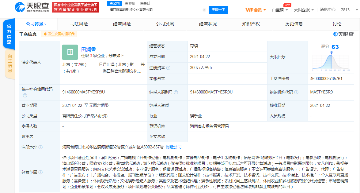 据天眼查APP显示,近日,海口胖喜炫影视文化有限公司成立,法定代表人为田润香,注册资本300万人民币,经营范围包括营业性演出;演出经纪;广播电视节目制作经营等,由潘粤明100%持股。