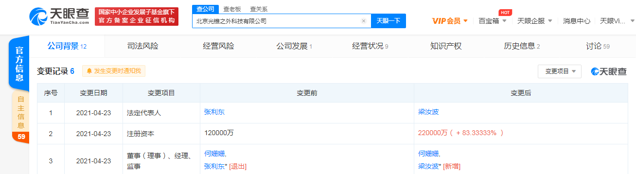 据天眼查APP显示,近日,北京光锥之外科技有限公司发生工商变更,注册资本由12亿增至22亿,增幅约83.33%,同时张利东退出法定代表人,由梁汝波接任。