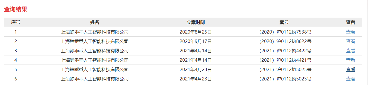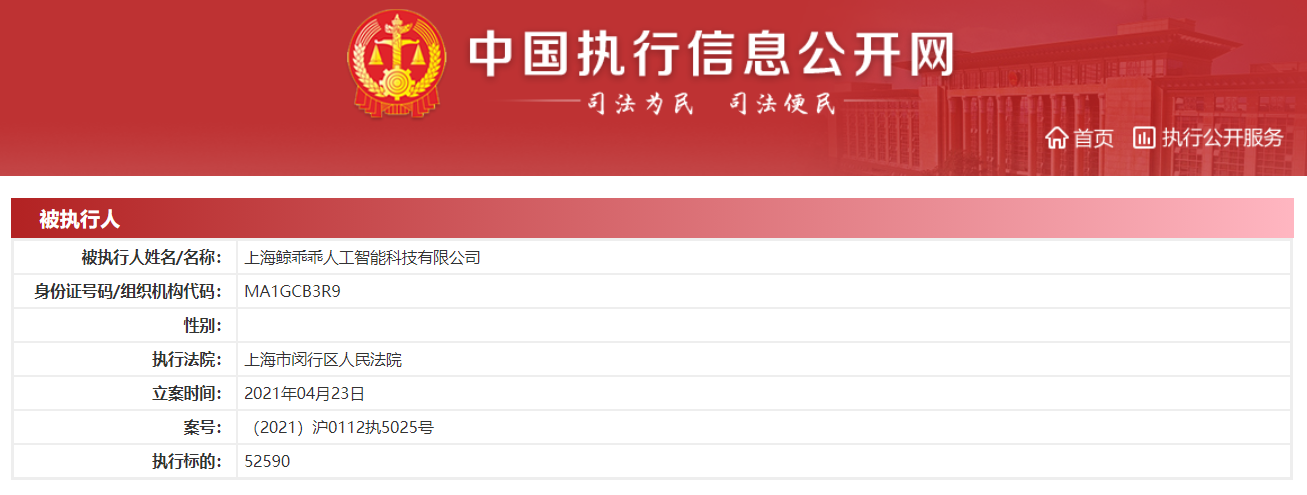 据中国执行信息公开网消息,4月23日,上海鲸乖乖人工智能科技有限公司新增一条被执行人信息,执行标的52590元,案号为(2021)沪0112执5025号,执行法院为上海市闵行区人民法院。