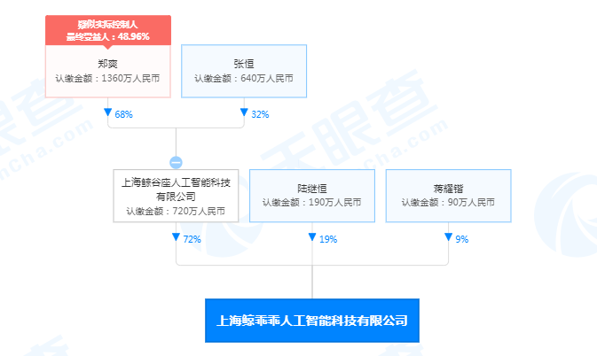 另据天眼查APP显示,上海鲸乖乖人工智能科技有限公司成立于2019年1月,注册资本1000万人民币,法定代表人为张恒,经营范围含人工智能应用软件开发;文化体育娱乐活动与经纪代理服务;电子商务;经营性互联网文化信息服务等。股东信息显示,该公司最大股东为上海鲸谷座人工智能科技有限公司,持股比例为72%,郑爽为其最终受益人、疑似实际控制人。