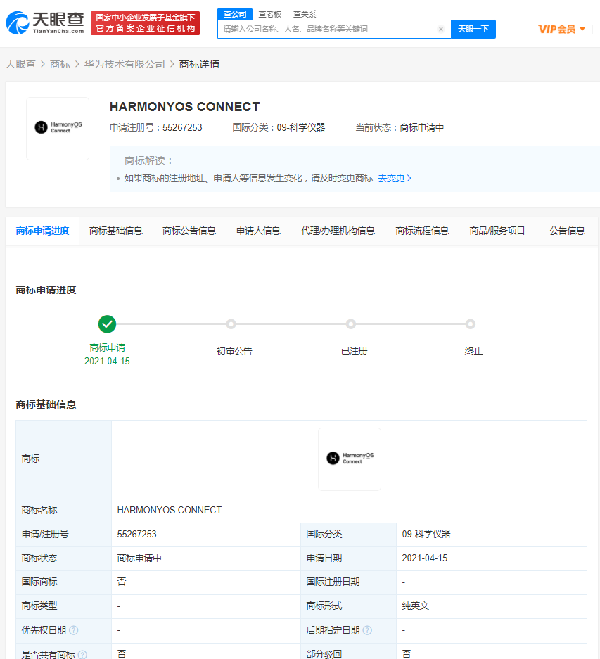 据天眼查APP显示,近日,华为技术有限公司申请注册多个“HarmonyOS Connect”图形商标及“鸿蒙智联”商标,国际分类涉及医疗器械、运输工具、科学仪器等,目前商标状态均为商标申请中。