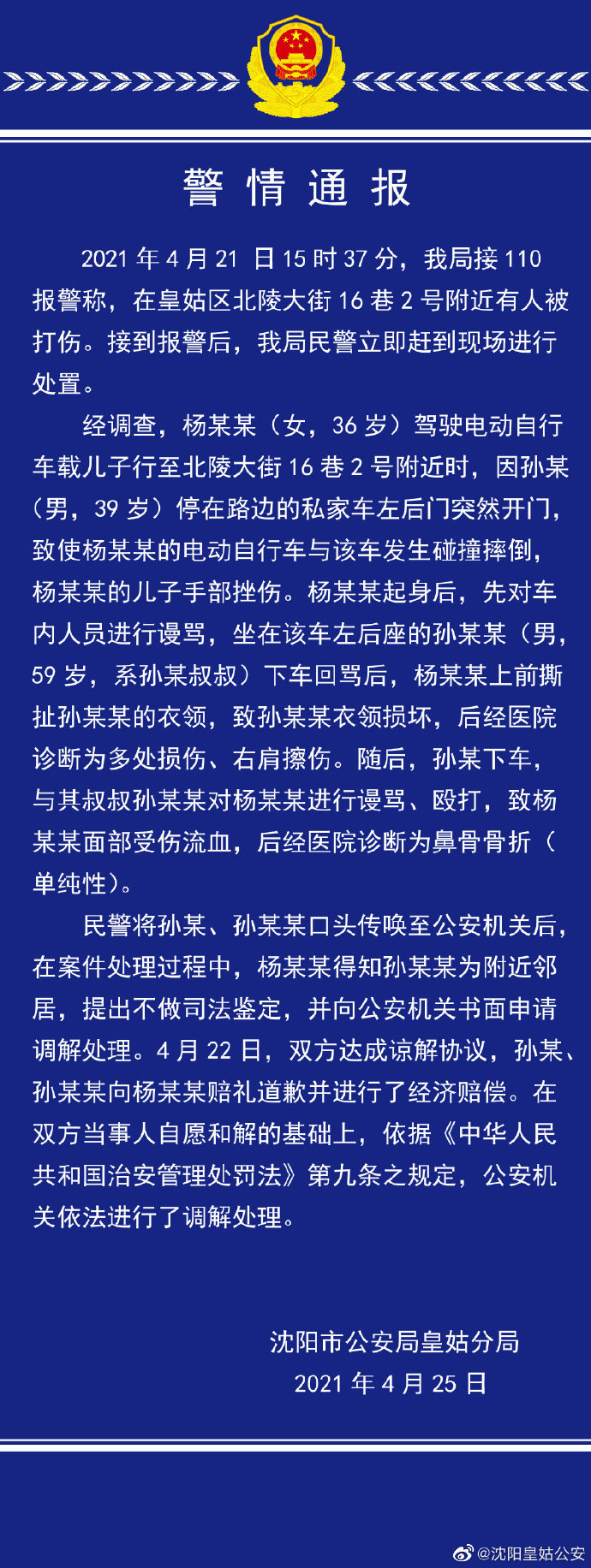 据@沈阳皇姑公安 4月25日通报,4月21日15时37分,公安局接110报警称,在皇姑区北陵大街16巷2号附近有人被打伤。