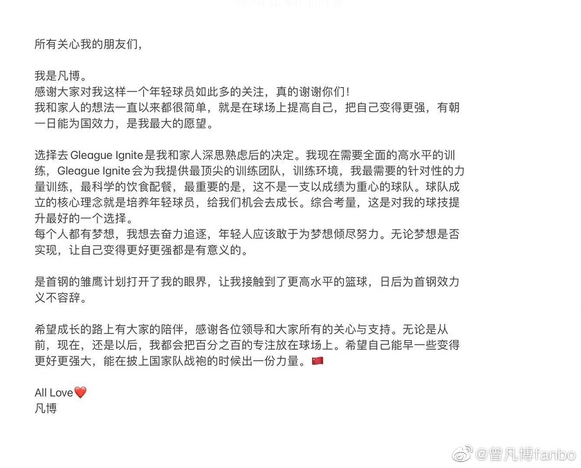 25日下午,曾凡博通过个人微博确认了这一消息。曾凡博表示,“我现在需要全面的高水平的训练。希望自己能早一些变得更好更强大,能在披上国家队战袍的时候出一份力量。”