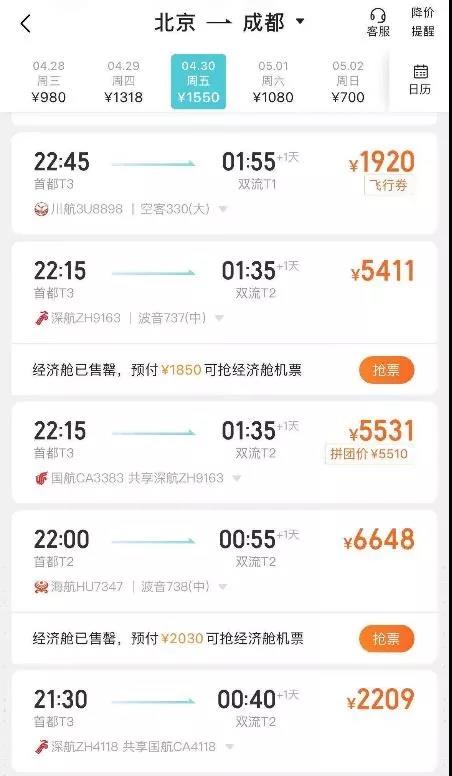 需求上涨也带动了票价走高。从携程公布的预订情况来看,热门旅游城市的“五一”火车票一经发售,便瞬间“秒光”。“五一”机票经济舱平均票价为1021元,超过2019年同期均价。据去哪儿公布的数据,北京-成都登顶五一最热航线。通过去哪儿平台搜索4月30日出发的北京至成都航线,多个晚上10点左右出发的航班仅剩商务舱。在此背景下,不到百元就能买到的盲盒的价格优势更为突出。