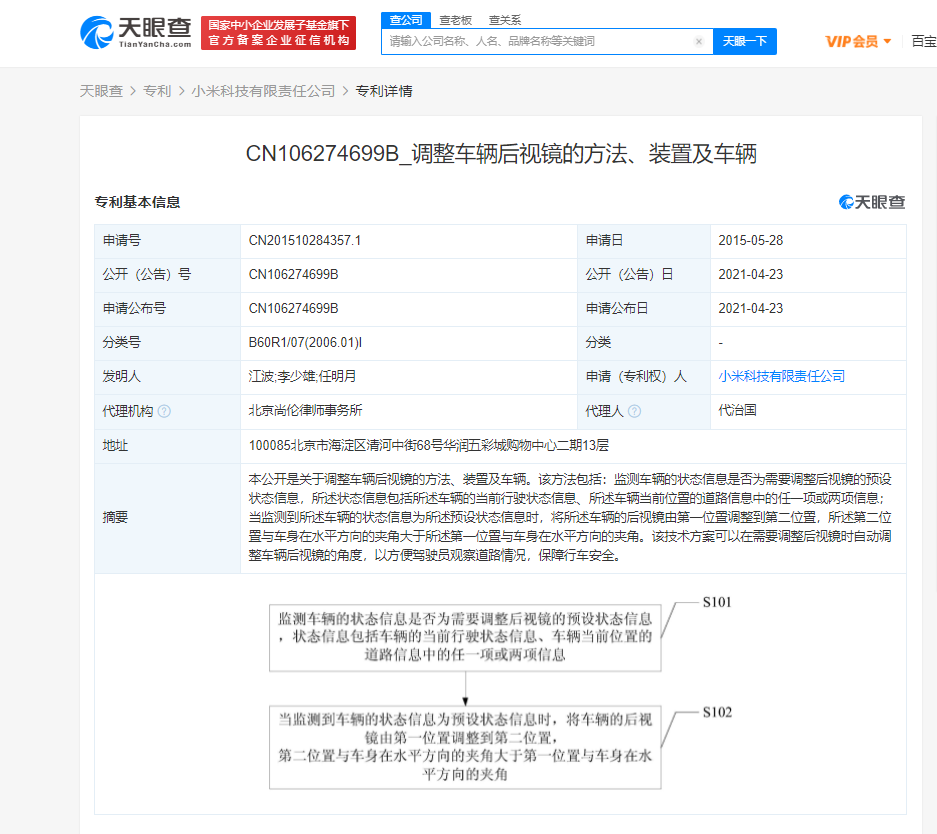 据天眼查APP显示,近日,小米科技有限责任公司公开一项名为“调整车辆后视镜的方法、装置及车辆”的发明专利,公开号为CN106274699B,申请日期为2015年5月。