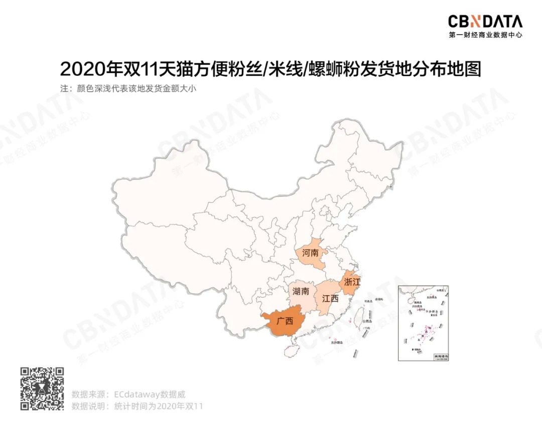 根据ECdataway数据威显示,2020年双11,方便粉丝/米线/螺蛳粉品类中,主营螺蛳粉的品牌在销售额TOP10中占据7席,阳际山野仅排名第9。该品类双11地域发货图显示,广西发货量一骑绝尘,远超其他省市。