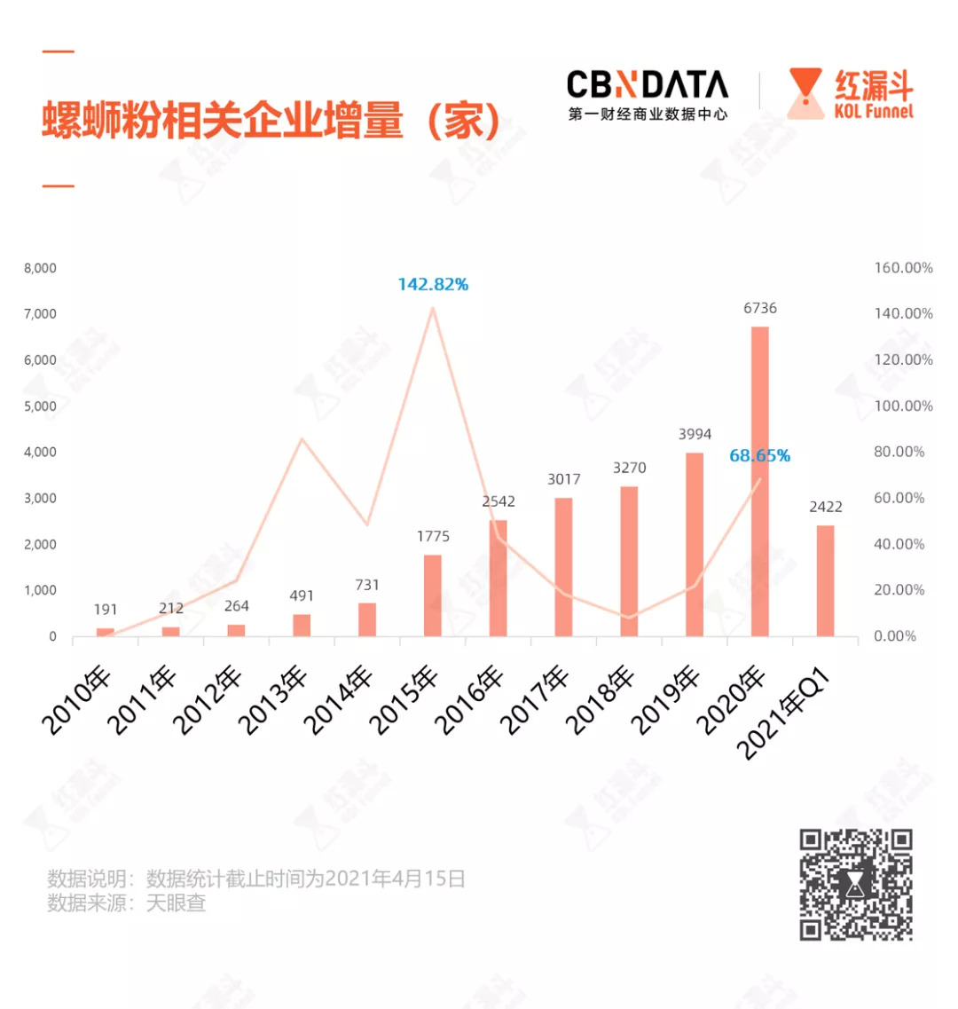 2019年,螺蛳粉呈出圈态势,网红品牌李子柒入局。2020年,螺蛳粉注册企业达到6736家,同比上年增长68.85%,全面开花。李子柒成为当年双11方便粉丝/米线/螺蛳粉细分品类Top 1。2021年第一季度,螺蛳粉新增企业注册数量达到2422家,超过去年全年1/3。