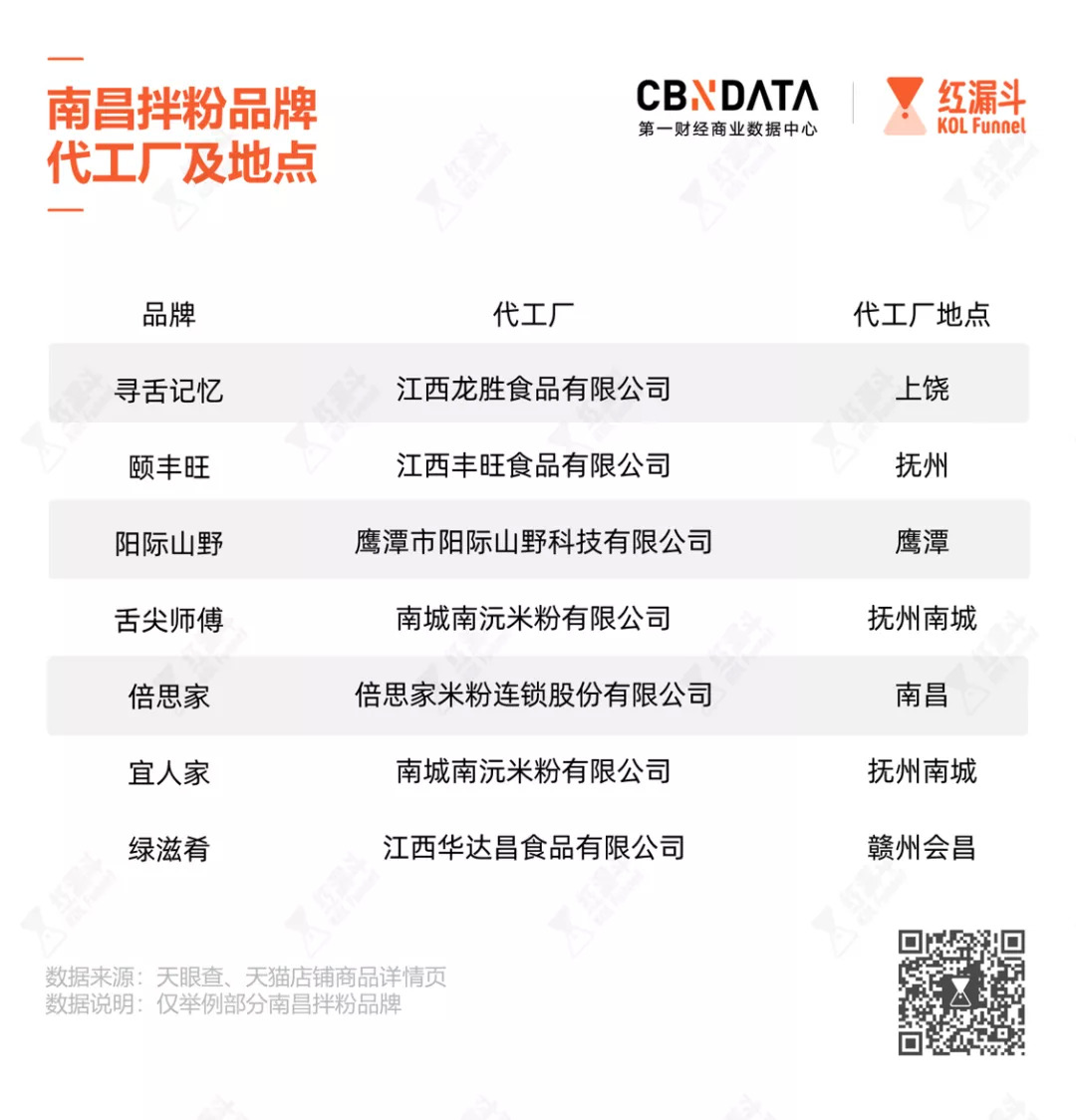 之前提到的7个南昌拌粉品牌中,只有寻舌记忆、倍思家、绿滋肴是南昌当地品牌。如果细究到代工厂,那么只有倍思家的自家工厂位于南昌,其余6个品牌的代工厂分布在上饶、抚州、鹰潭、会昌。宜人家与舌尖师傅两个品牌的代工厂,都是抚州南城南沅米粉有限公司。