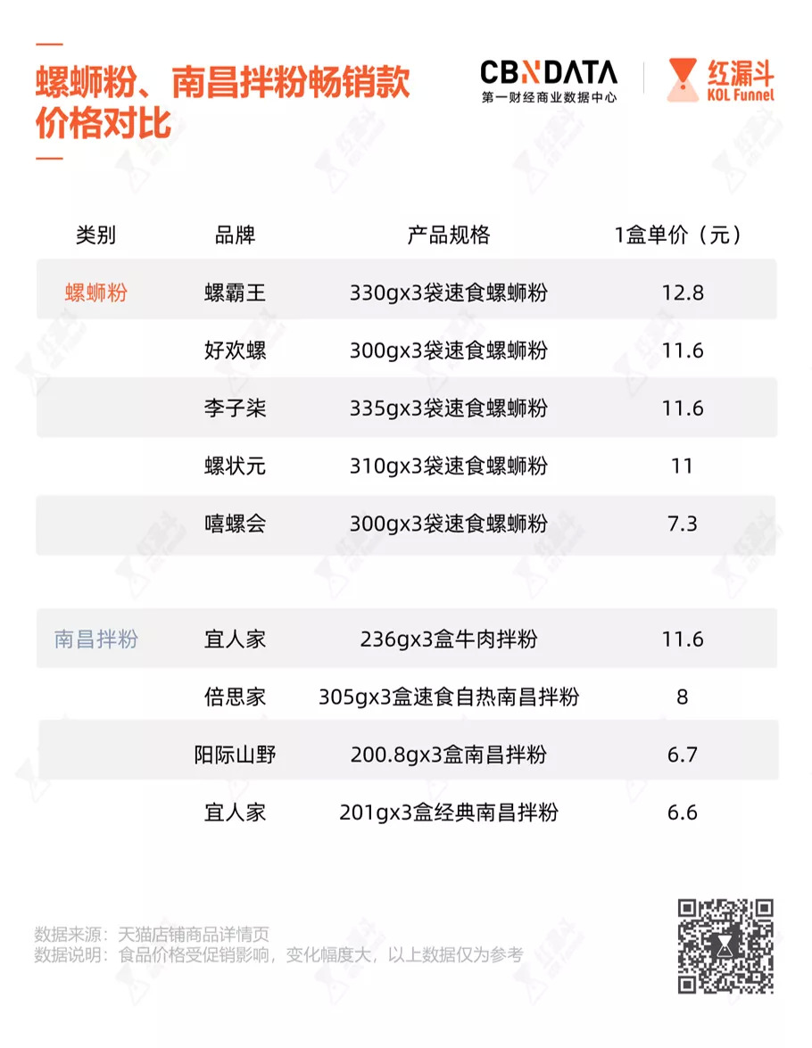 价格方面,螺蛳粉品牌形成一定的梯队。以最畅销的3盒装为例,部分品牌螺蛳粉基础款价格超过11元/袋,南昌拌粉(素拌粉)平均1盒单价为6-7元。
