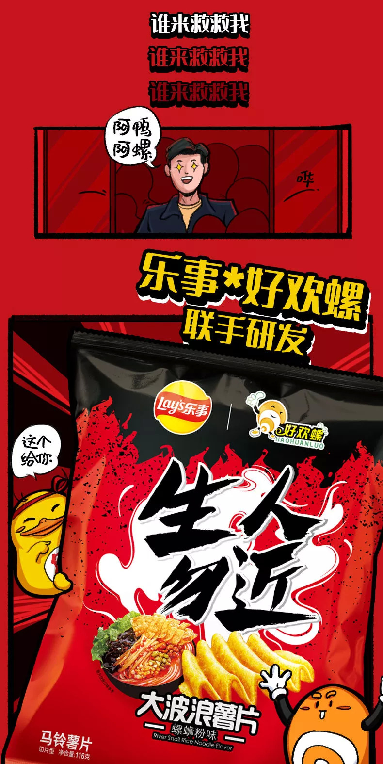 最简单的联名是在包装上花心思,复杂的联名是深入到产品端,比如好欢螺与乐事最近推出的螺蛳粉口味薯片。