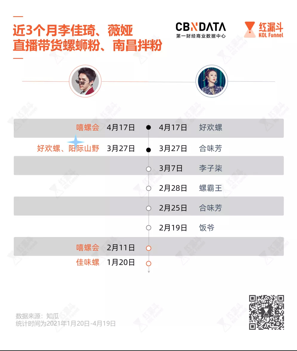 知瓜数据显示,最近3个月内,薇娅、李佳琦均推荐过多个品牌的螺蛳粉,除好欢螺“一家通吃”,分别上过两人直播间,其余品牌都没有获得此项殊荣。李佳琦、刘涛在本周期内都推荐过1次阳际山野的南昌拌粉,刘涛本人没有推荐过螺蛳粉品牌。