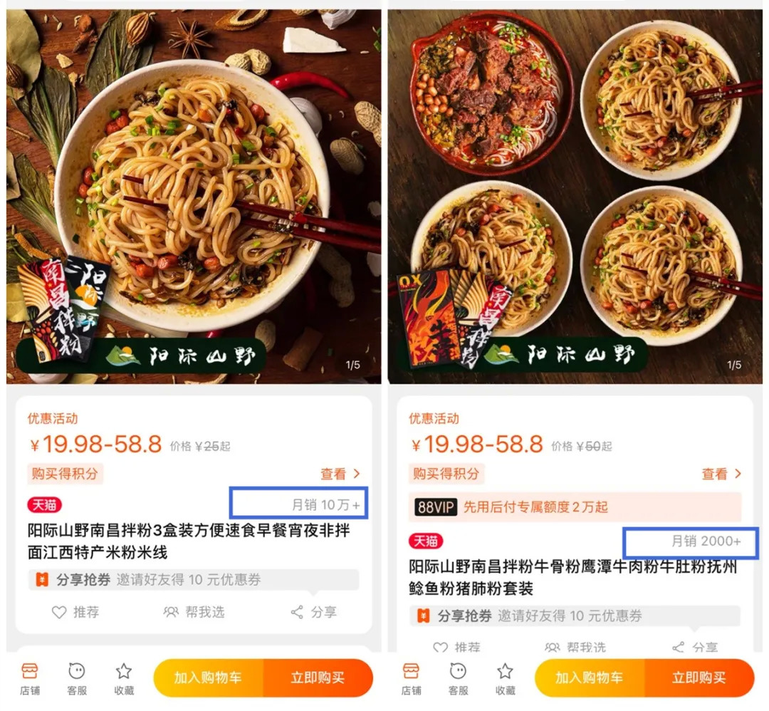 过去一年,江西本土品牌阳际山野占据了米粉界的一席之地。凭借在刘涛、李佳琦、付鹏等顶流主播直播间频繁露脸,阳际山野的南昌拌粉迅速成为一款爆品。