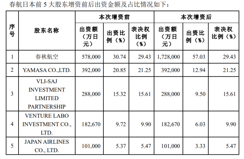公告还列出春航日本前5大股东增资前后出资金额及占比情况,图表显示,春秋航空增资后,日本航空出资比例相应降低,从5.37%减少至3.33%,表决权比例不变,仍为5.47%。