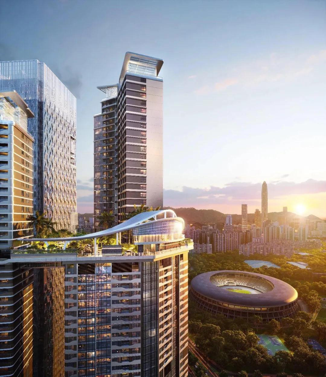 此外,项目无缝接驳空中连廊系统,串联体育中心、笔架山公园、莲花山公园等各项配套,推窗可见绿,举步到山林。