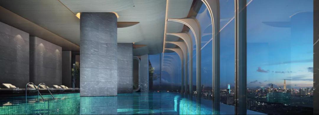 会所配有高空室内无边际恒温泳池、云端健身中心、私人宴会厅等设施,正面还可饱览银湖山、笔架山的无敌景观,通过对于空间规划与自然美学的精准把控,构筑全维度高端私密生活圈。