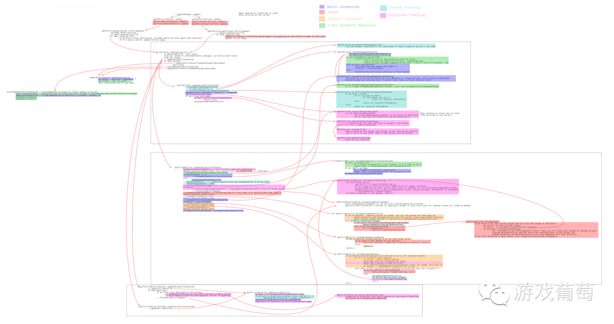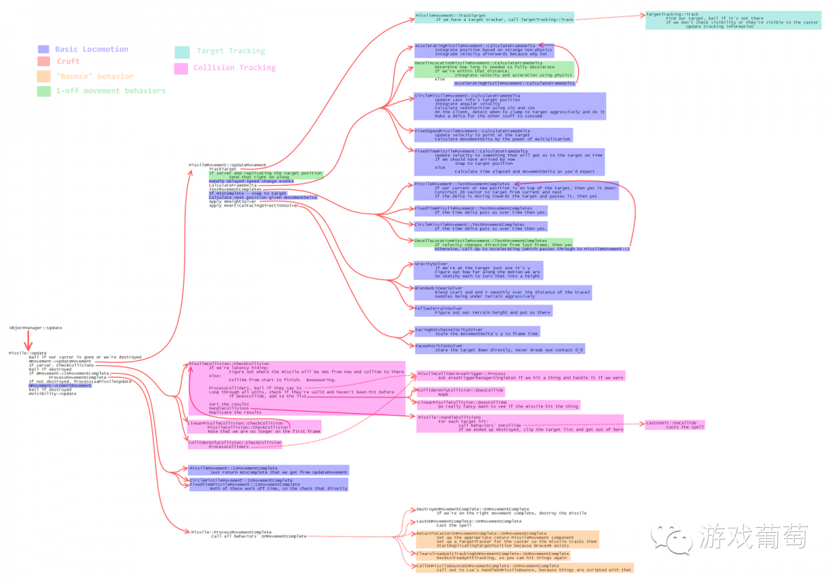 游戏中的弹道技能不像导弹引导系统那样复杂,但一些复杂的飞弹运动方式还是让改动变得有风险。简单来说,这张结构图是我们划分出的弹道技能分层,不同部分对应不同技能的飞弹类别。这些不同类别的功能性有时是共享的,有时候则是直接复制的,还有更多时候让人觉得很混乱。通过整合相近功能性颜色代码,这张表从水平的角度打散了这些飞弹类型。比如说,如果你想要了解弹道技能飞弹的碰撞追踪,你需要逐一浏览这些标成粉色的代码,它们分散在这张表的各处。