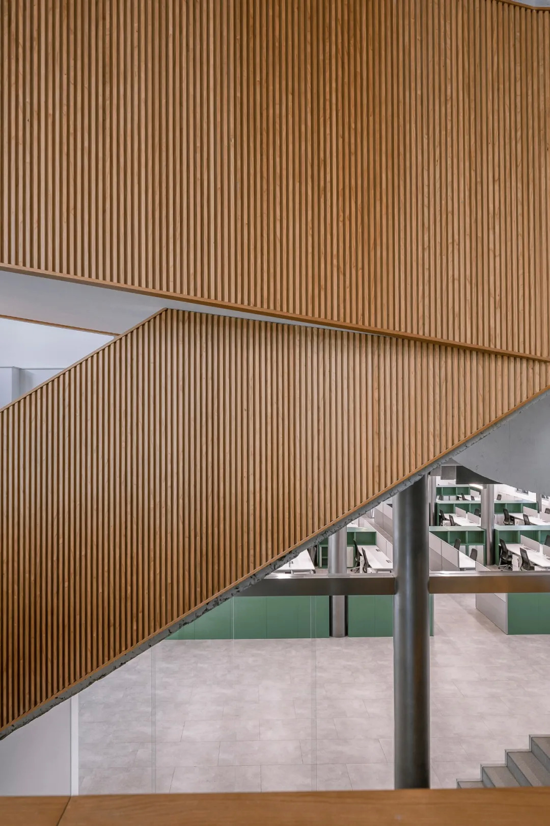 室内则采用新安装的木栏杆重新连接原有结构的各层楼梯和立面,将原本杂乱的空间有序整合起来,使其更显庄重。在白墙和横梁的衬托下,木丝带穿梭于中庭和巨大的月洞之间,将各时代的建筑遗留联结在了一起。