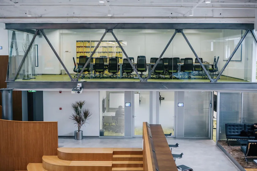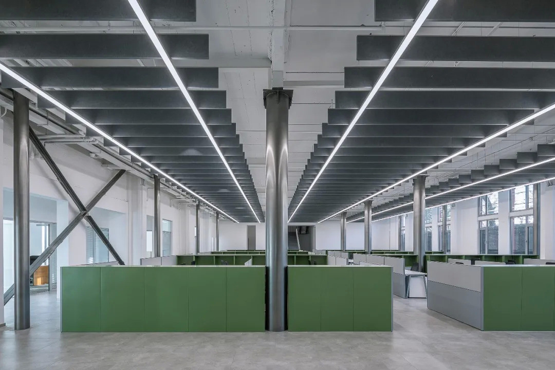 绿色的办公柜和工作台按照原有的钢柱形成的网格安放。悬挂在空中的吸音板和条形照明,像轨道般,在视觉上营造出了统一感。