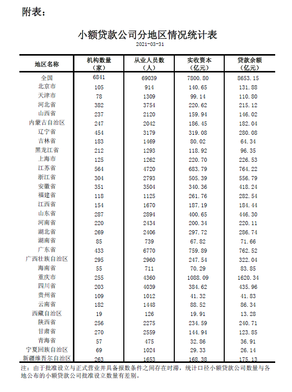 报告披露,截至2021年3月末,全国共有小额贷款公司6841家,相较2020年12月末的7118家,今年一季度,全国小贷公司的数量减少了277家。值得一提的是,从业人员数量69039人,2020年末该数据为72172人,减少了3133人。