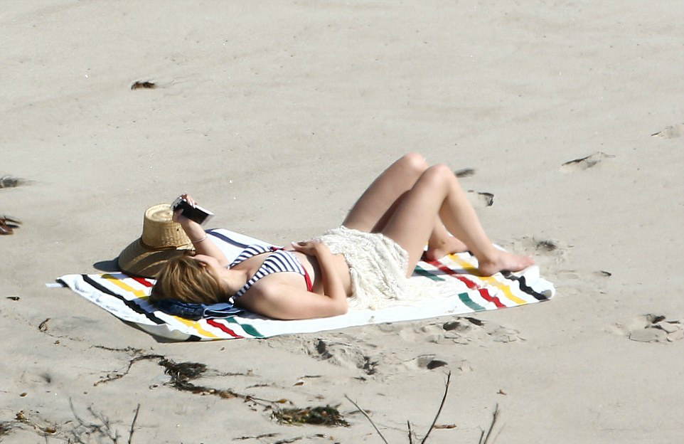 尽管她的最新主打叫《Honeymoon》,拉娜·德雷上周三享受了一个人的阳光,沙滩和海浪。宣传期中忙里偷闲,拉娜·德雷身穿海魂比基尼,在马里布的海滩度过了悠闲的下午。她躺在条纹浴巾上,草帽随意丢在旁边,想趁休假美美地晒黑。