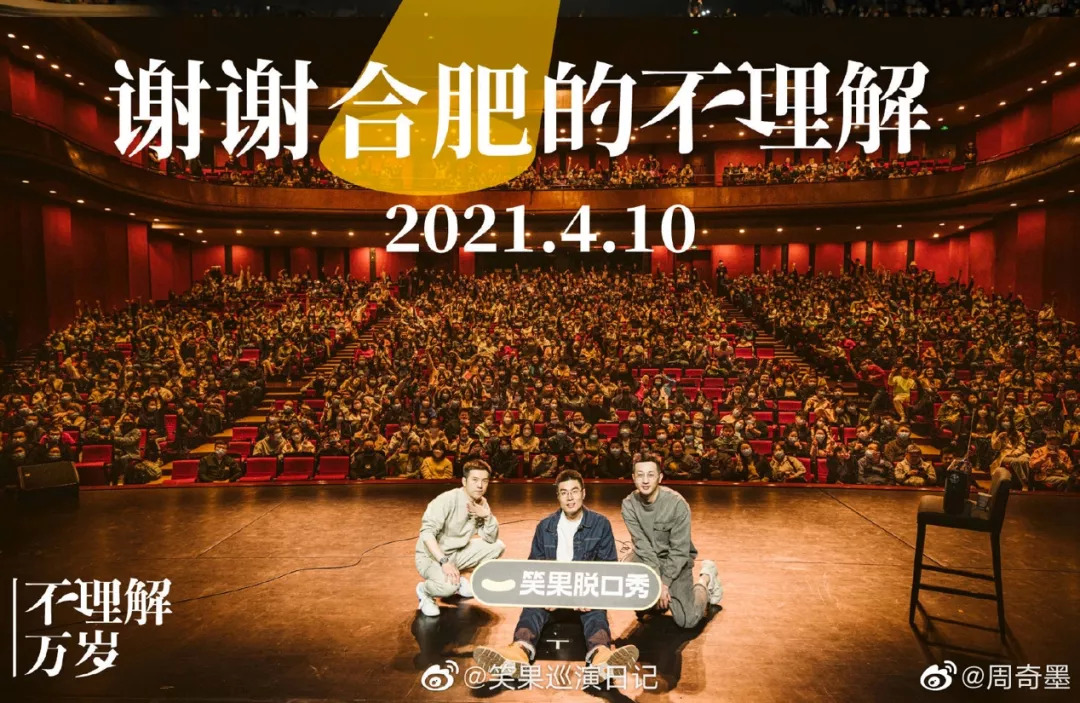 除了将线下定点演出拓展到南京,最近笑果还在为《脱口秀大会》第三季选手、来自另一喜剧厂牌单立人喜剧的周奇墨做了个人专场大型巡演,共覆盖22个城市,几乎都是千人级别的剧场(如长沙梅溪湖大剧院等),这种规模的巡演对演员精力和专业性的要求显而易见。
