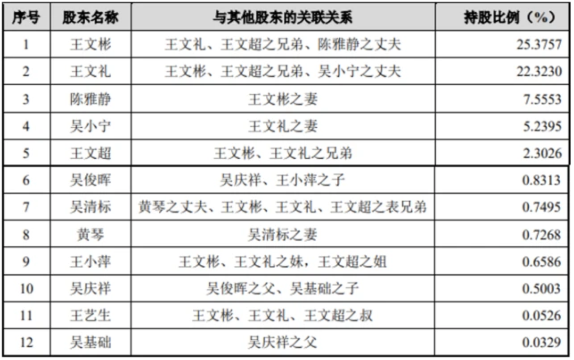 公司的自然人股东中还包括吴俊晖、吴清标、黄琴、王小萍、吴庆祥、王艺生和吴基础。其中,王小萍是王文彬的亲妹妹、王艺生是王氏三兄弟的叔叔;吴俊晖是王小萍的儿子,吴庆祥是王小萍的丈夫、吴基础是吴庆祥的父亲;吴清标是王氏三兄弟的表兄弟,黄琴则是吴清标的妻子。