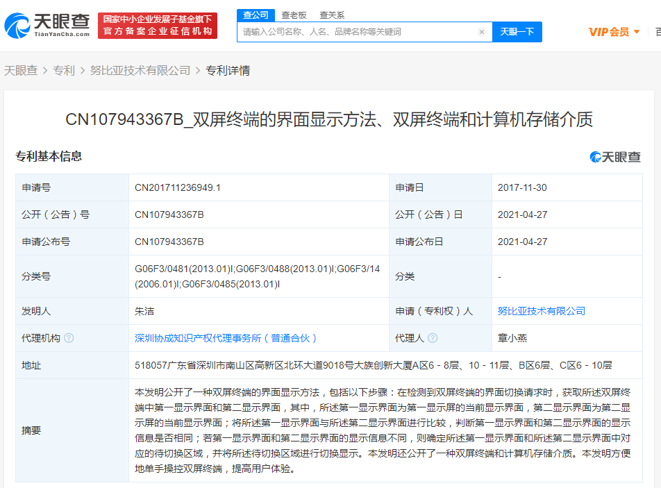 据天眼查APP显示,4月27日,努比亚技术有限公司获得一项“双屏终端的界面显示方法、双屏终端和计算机存储介质”发明专利授权,公告号CN107943367B,申请日期为2017年11月。