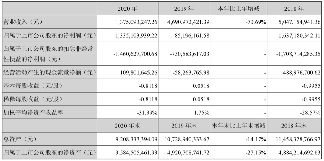 4月26日晚,海马汽车股份有限公司(000572.SZ,以下简称“ST海马”)发布2020年年度报告。年报显示,2020年ST海马实现营业收入13.75亿元,同比下滑70.69%;归母净利润-13.35亿元;归母扣非净利润-14.61亿元;基本每股收益-0.8118元/股。