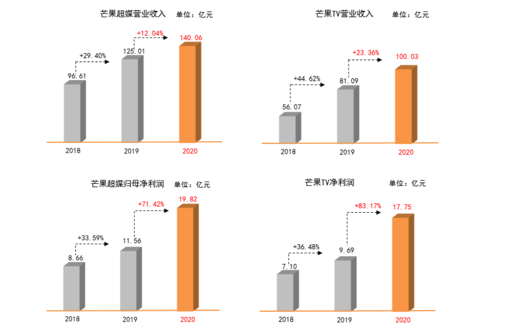 年度报告显示,2020年全年芒果TV会员、广告、运营商等各项业务持续发力,其运营主体快乐阳光实现营业收入100.03亿元,同比增长23.36%;实现净利润17.75亿元,同比增长83.17%。