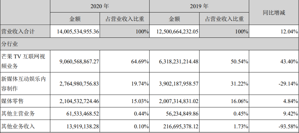 在年报中,芒果超媒就2020年全年从事的营收业务做了详细说明,其主要营业收入围绕芒果TV互联网视频业务、新媒体互动娱乐内容制作、媒体零售、其他主营业务和其他业务收入展开。
