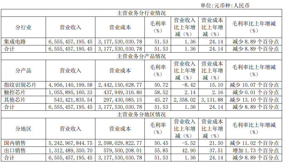 汇顶科技主营产品分为三大类——指纹识别芯片、触控芯片、其他芯片。其中,指纹识别芯片占总营收的75.60%,较上一年83.67%的营收占比缩水了8.07个百分点。营收占比下滑的同时,指纹识别芯片毛利率也大降10.07个百分点,并拖累公司整体综合毛利率同比下降8.12个百分点至52.27%。