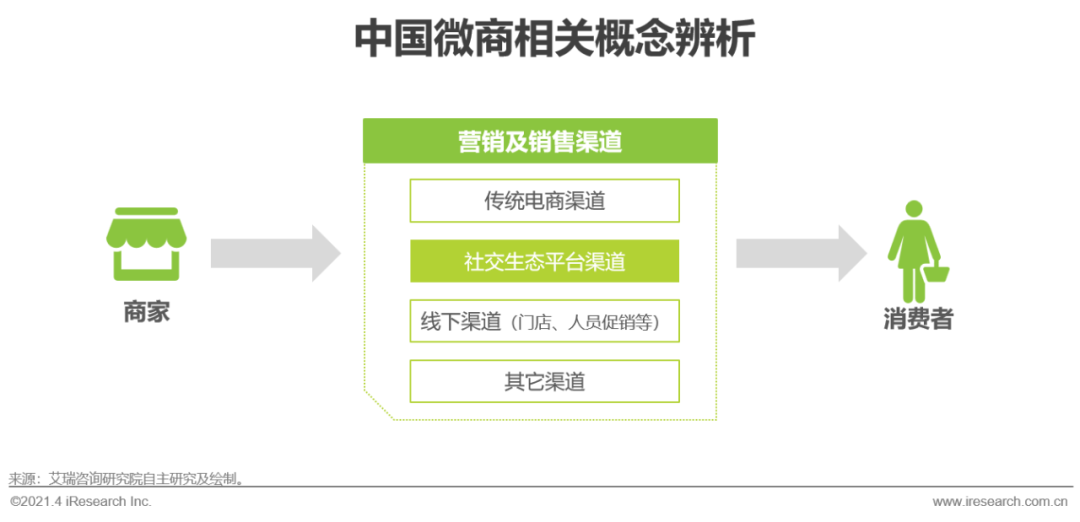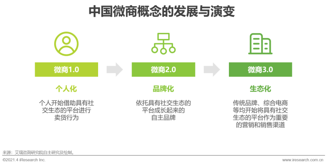 在微商最早进入大众视野的时候,正处于社交生态平台的普及期,微商更多表现在用户个人借助社交生态平台进行卖货的行为;而随着社交生态媒体的影响力越来越大,开始逐渐涌现出一批依托社交生态平台成长起来的自主品牌,微商也开始被用来形容这些社交生态下的品牌和商户;在行业愈加规范后,传统品牌和综合电商也纷纷加入社交生态平台的营销与销售布局中,微商已经成为一种新兴且在不断成熟的销售渠道与生态,各行各业都逐渐开始在微商模式上投入更多的精力和资源。