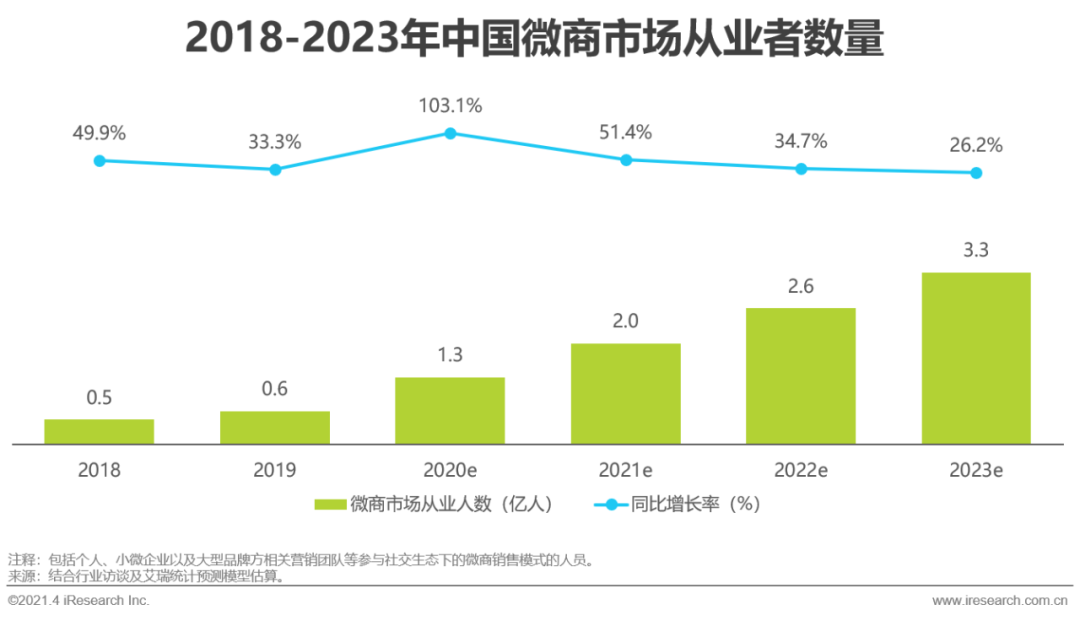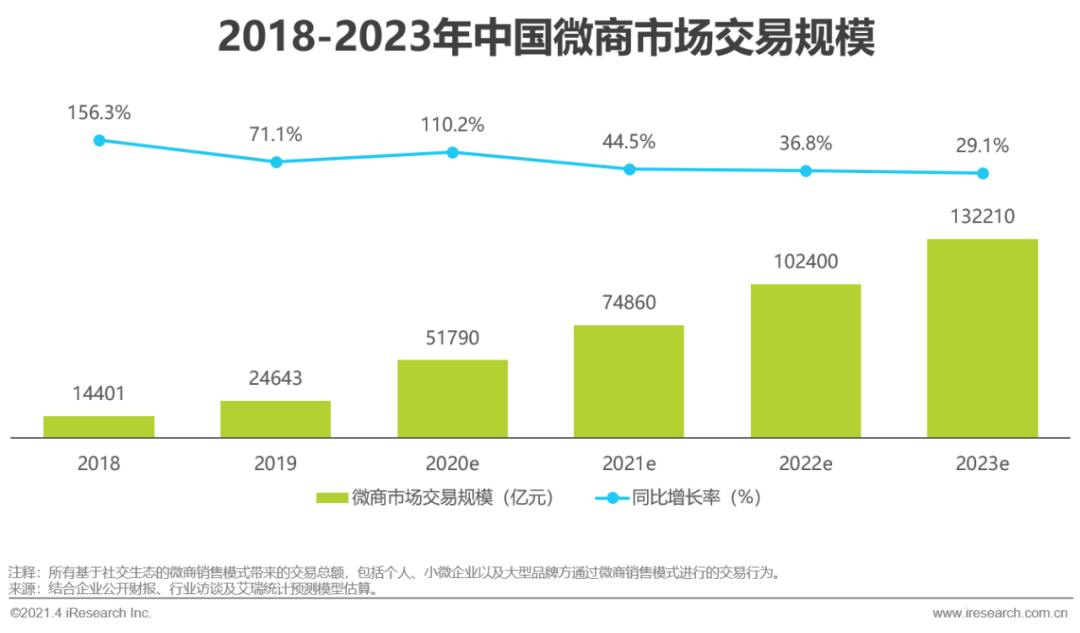 随着互联网社交生态的不断发展,微商的概念范畴也在不断演进,目前包括大型品牌方、个体户、电商平台等在内,所有基于社交生态平台进行销售和营销行为的商户都可以称之为微商。在外部环境和各行业需求渗透的驱动之下,2019年中国微商市场交易规模已经超过两万亿元,中国微商市场从业人数达0.6亿人。