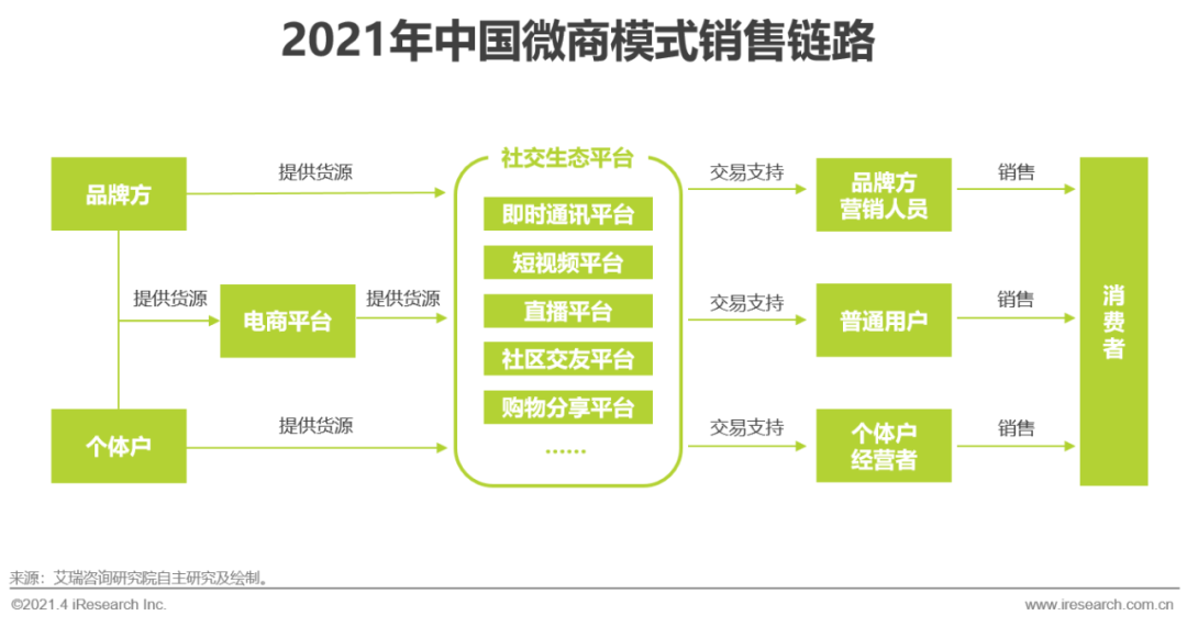 微商模式下的销售链路主要分为三个部分。从上游来看,主要由大型品牌方、个体户、电商平台等提供货源,其中大型品牌方和个体户既可直接与社交生态平台合作,也可通过电商平台和社交生态平台进行链接。从中游来看,主要由以即时通讯、短视频、直播、社区交友、购物分享等平台为代表的社交生态平台对上下游进行链接,一方面为货源方提供流量支持,一方面为消费者提供更加便利的社交消费渠道。而在下游,还有大量的微商从业人员,包括大型品牌方营销人员、普通用户、个体户经营者等,基于社交生态平台对消费信息进行分发传播,进一步扩大消费的流动和裂变。