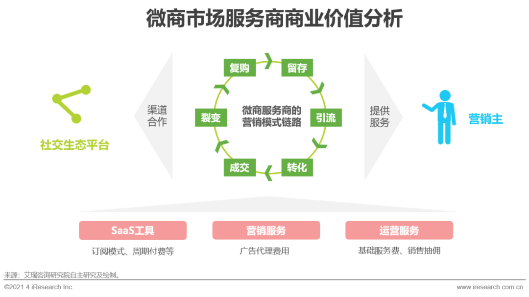 为了更好地帮助各行业的营销主在社交生态平台上进行更好地微商模式探索,同时也帮助社交生态平台更好地服务客户,微商服务商的角色应运而生。微商服务商往往通过基于引流、转化、成交、裂变、复购、留存的微商模式循环链路,从不同服务场景切入,在社交生态平台和营销主之间建立深度的链接,进而实现商业化变现。通常来讲,SaaS工具、营销服务和运营服务是微商市场服务商的主要商业模式,未来随着越来越多的行业和营销人员加入到微商模式的浪潮中,中国微商市场服务商的发展空间也将越来越大。