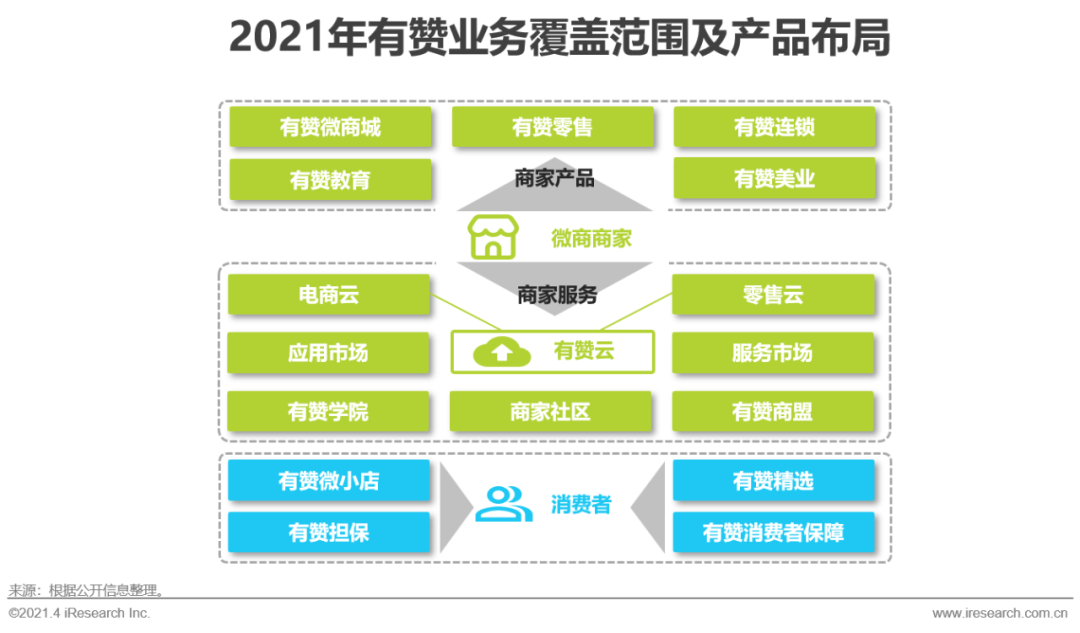 有赞是一家主要从事零售科技服务的企业,于2018年4月完成在港上市。目前基于社交网络,其旗下拥有如有赞微商城和有赞零售等全面帮助商家经营移动社交电商和全渠道新零售的SaaS软件产品及人才服务;面向开发者的“有赞云”PaaS云服务,汇聚业内丰富的工具、组件、定制服务,与商家后台无缝衔接,满足各类功能场景需求;面向品牌商和消费者也分别有如有赞广告、有赞精选等有较强针对性、智能性的服务。