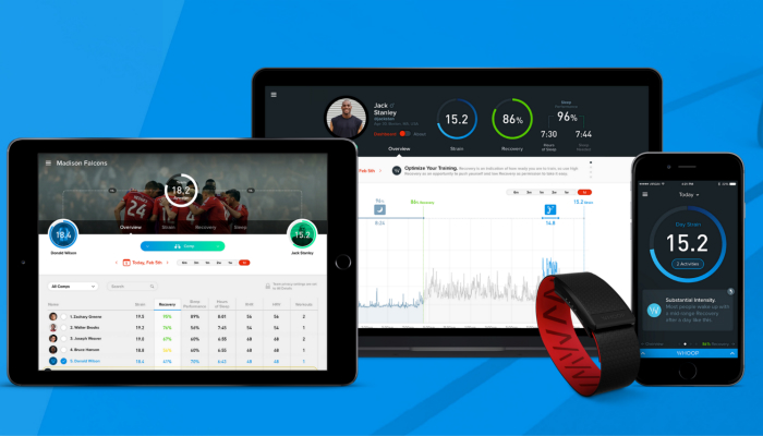可能大多数人并没有听说过Whoop,它可能是运动领域中最有趣的产品了。它是一款能够对用户进行全天候生理指标监控的手环,能收集到一些其它设备没办法收集到的数据;一个标准的Fitbit不能提供环境温度、恢复数据和心率变异性的数据。但是,Whoop能够脱颖而出的地方就在于能够改变运动员行为,而不仅仅只是告知数据。该设备能够根据采集到的数据,为使用者量身打造训练计划,提供具有可操作性的建议。Whoop系统分析的数据主要包括三大方面:每日强度分数——反应身体的紧绷程度;恢复系数——量化用户身体对于运动的准备程度;睡眠表现。