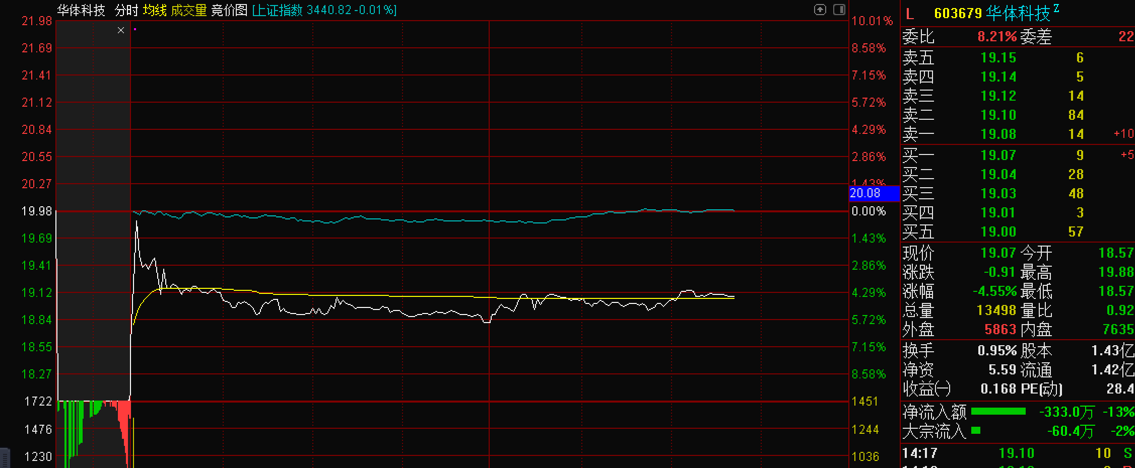 4月27日,华体科技在集合竞价之时,因业绩不振,甚至一度被摁在跌停板位置,开盘后有过快速拉升,但截至收盘未能翻红,当日该股收于19.06元/股,跌4.6%。