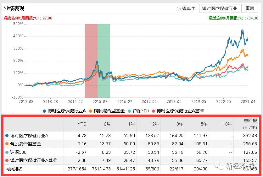 截至2021年4月26日,在今年来偏股混合型基金整体平均收益勉强实现正收益的情况下,博时医疗保健大幅跑赢。同期,偏股混合型基金、沪深300以及基金业绩基准净值增长率分别为0.16%、-2.57%、2.00%,而博时医疗保健行业A今年来净值回报率为4.73%。(数据来源:Wind)。