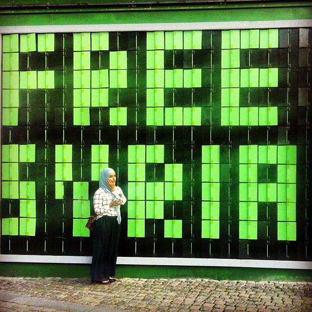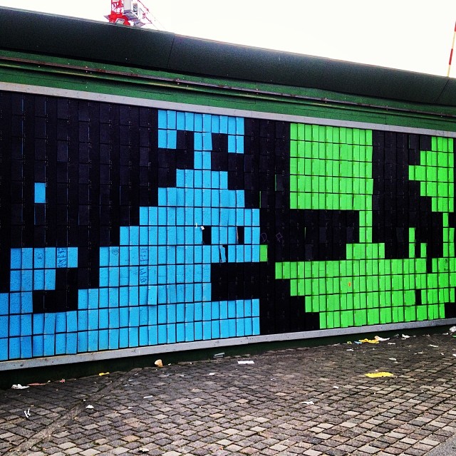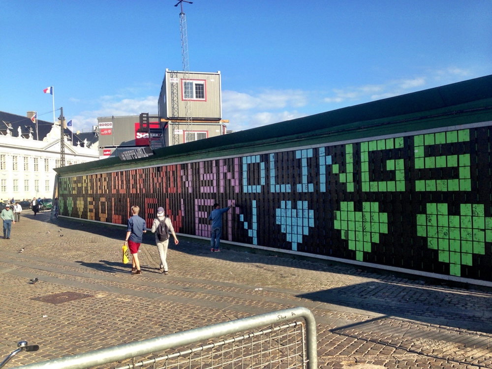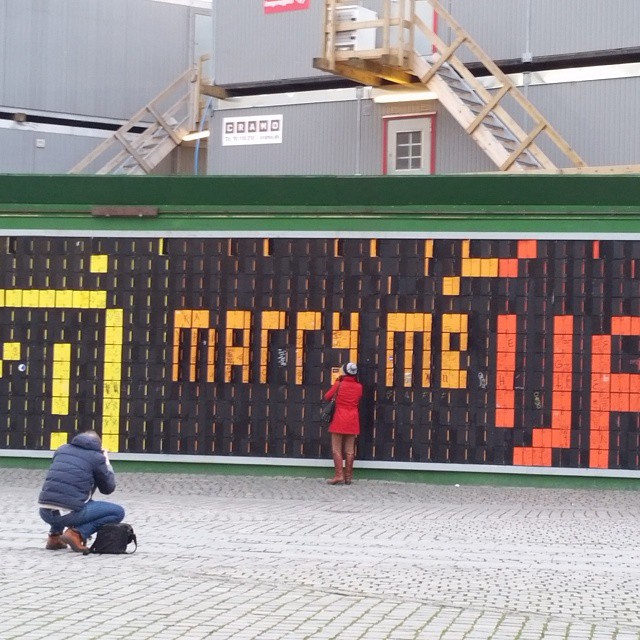 在丹麦,哥本哈根国王新广场,他用1728块不同颜色的,可翻转的废旧木板,铺满了地铁站边的一整面墙。