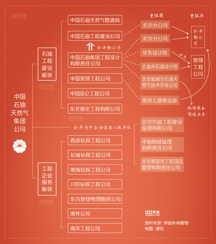 界面新闻记者获悉,该板块重组的初步方案为,中国石油集团工程设计有限责任公司(下称工程设计公司)由工程建设公司全盘接收,工程设计公司北京分公司、工程建设公司北京分公司,将与中国寰球工程公司(下称寰球公司)上游事业部合并。