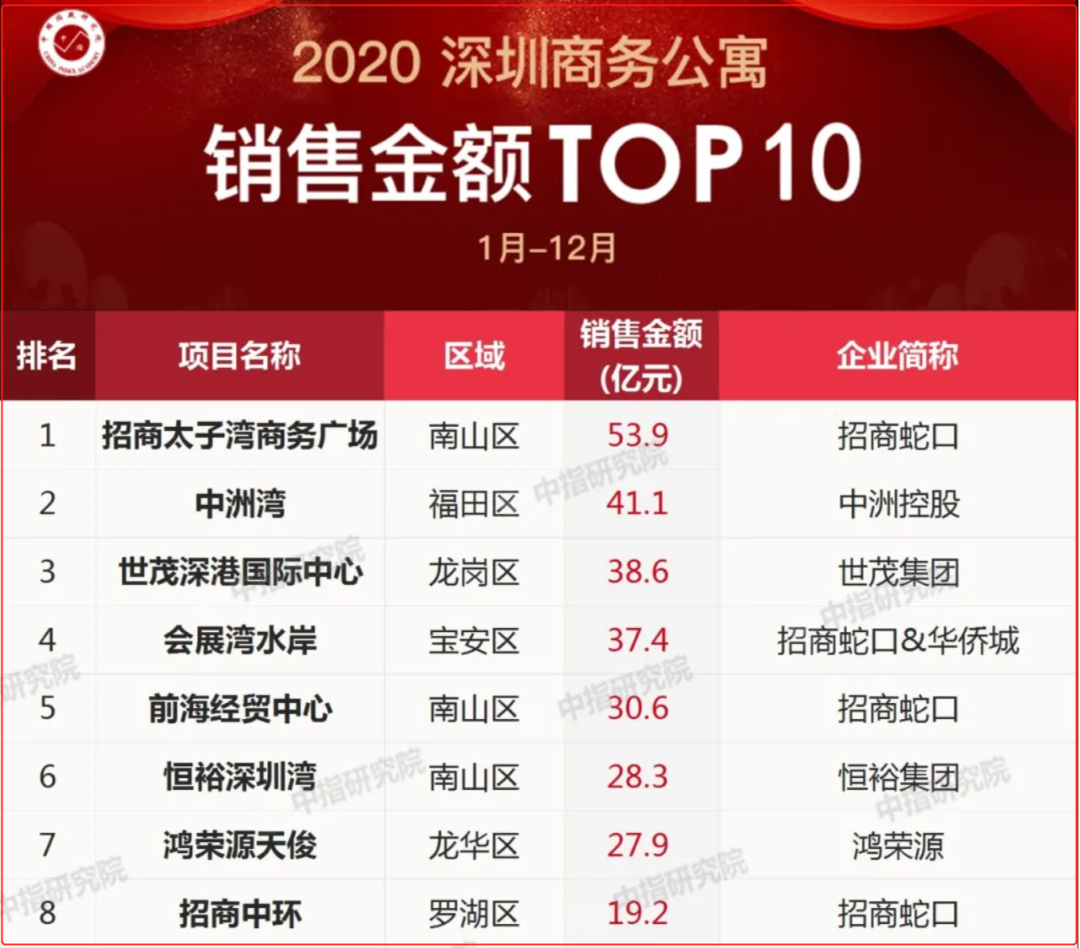 2020年,深圳商务公寓榜单上,销售金额超过40亿的,仅有两个项目,第五名刚刚超过30亿水平线,第八名则未到20亿。