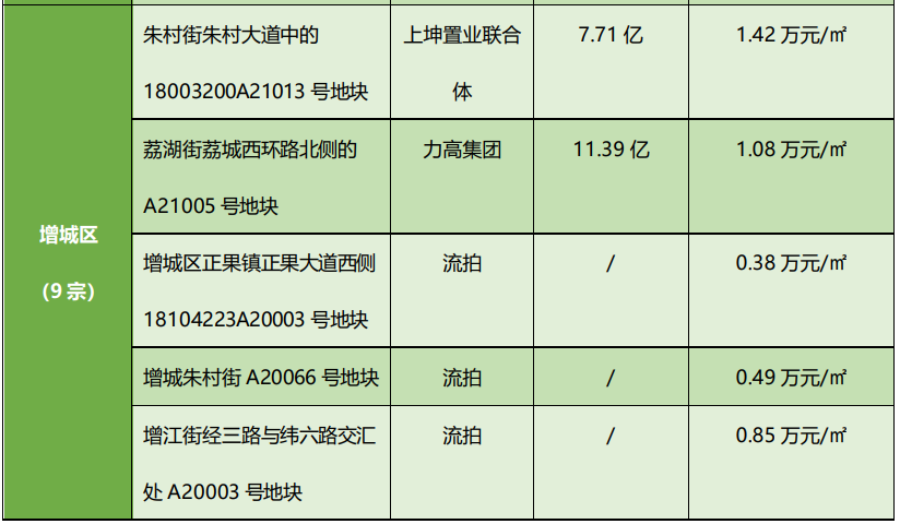 其中,增城有3宗地出现流拍,分别为增城区正果镇正果大道西侧18104223A20003号地块、增城朱村街A20066号地块、增江街经三路与纬六路交汇处A20003号地块。