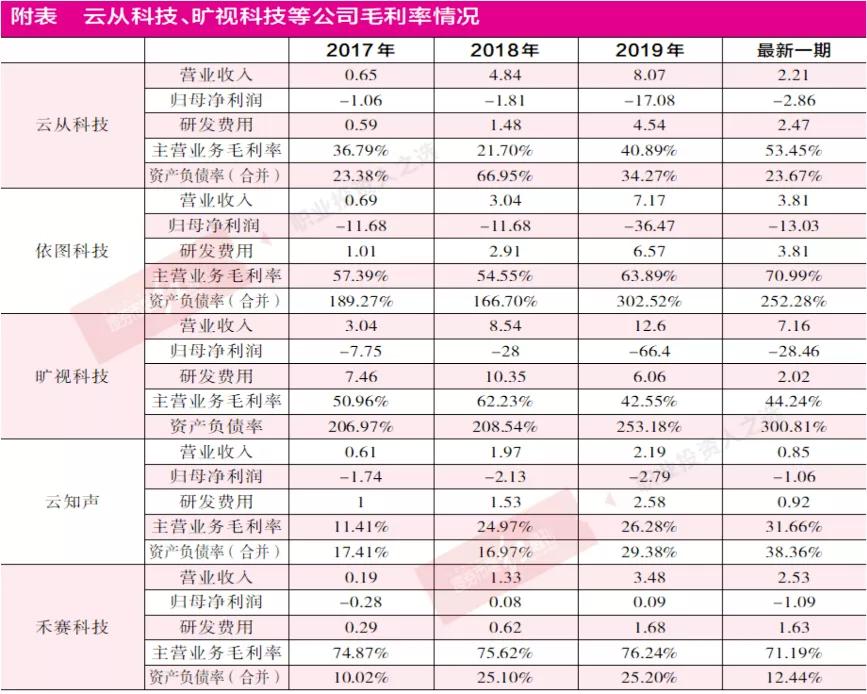 值得注意的是,在报告期内云从科技、旷视科技主营业务毛利率波动较大,且公司综合毛利率低于同行业上市公司平均水平。相比之下,依图科技主营业务毛利率呈上升趋势,2020年1-6月其毛利率略高于行业平均水平。(见附表)