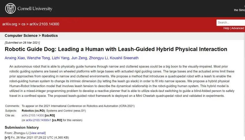 当地时间3月26日,这项研究已经预收录在学术平台arXiv上,论文题目为《机器导盲犬:用皮带引导的混合物理互动引导人类(Robotic Guide Dog: Leading a Human with Leash-Guided Hybrid Physical Interaction)》。