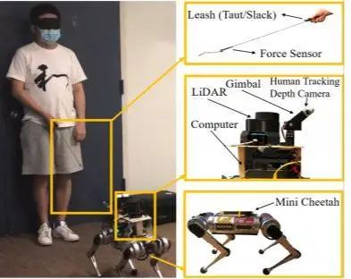 李钟毓团队研发的机器导盲犬基于一个名叫Mini Cheetah(小猎豹)的小型四足机器人,配备有2D激光雷达、3D摄像头,以及一个带有力传感器的可拉伸皮带。这些配置使机器人可以感应环境、追踪主人的位置,并且能拉紧或松开皮带来牵引主人。