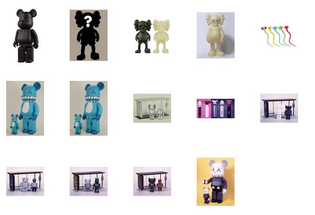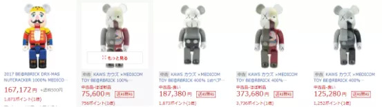 与艺术家合作或和知名品牌联名推出的BE@RBRICK则采用了单独销售的方法,这些款式的玩具有各式各样的尺寸,价格一般在一千人民币以上。例如BE@RBRICK与Kaws的合作款,在电子商城里,其价格最低的款式也在5000元以上。